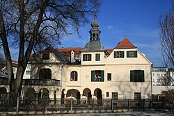 Der zweigeschoßige Baukörper mit hakenförmigem Grundriss hat ein Fußwalmdach und eine späthistoristische Fassadengestaltung. Am West-Trakt seit 1898 polygonale Erker angebracht. Die Säulenarkaden des Erdgeschoßes stammen zum Teil noch aus dem 17. Jahrhundert. Der Rest wurde ebenfalls 1898 hinzugefügt. Ein eingeschoßiger Kapellenturm wird von einer Kuppel und einer achteckigen Laterne bekrönt. An der Nordwest-Ecke des Gebäudes steht ein Altan auf Säulen mit einer Balustrade. Die figurale Türverzierung aus Stuck stammt aus dem Jahr 1898.[3]