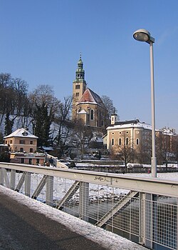 Erzbischof Johann II. von Reisberg begann für eine nun deutlich gewachsene Kirchengemeinde im Jahr 1439 mit dem Neubau der Kirche in Form einer gotischen Saalkirche, die in ihrer Grundsubstanz bis heute erhalten ist. Diese Kirche wurde kurz nach 1460 Pfarrkirche, die aber später immer mehr verfiel. Erzbischof Wolf Dietrich erneuerte die Kirche, baute sie um und übergab sie den Augustiner-Eremiten als neue Klosterkirche. 1674 bekam die Kirche ihren barocken Zwiebelhelm und einen straßenseitigen Vorbau, hinter dem sich das geräumige Stiegenhaus mit seinen Malereien und seiner Dreifaltigkeitskapelle verbirgt. Turm und Vorhaus wurden von Baumeister Sebastian Stumpfegger, der auch als Mitarbeiter von Fischer von Erlach arbeitete, errichtet. 1833 wurde die Kirche den Benediktinern zu Michaelbeuern übergeben. Bekannt ist in der Kirche der Hochaltar mit seiner Gnadenmadonna samt Jesuskind (um 1460 entstanden).