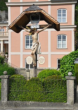 Schon Anfang des 18. Jahrhunderts und wohl schon früher stand am Salzachufer in Mülln ein Kruzifix, das hier als wundertätig verehrt wurde. Dieses Kreuz musste 1801, morsch geworden, abgetragen werden. Daraufhin wurde ein Doppelkreuz, von der Salzach aus für Schiffer und von der Fahrstraße in die Stadt aus gut sichtbar, errichtet. Diese Flusskreuz schenkte um 1900 der damalige Eigentümer der Pfarre Mülln.