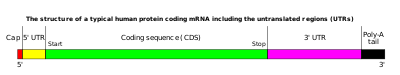 | Diagramatic structure of a typical human protein coding mRNA including the untranslated regions (UTRs).It is drawn approximately to scale. The cap is only one modified base, average en:5' UTR length 170, en:3' UTR 700. | Eigenes Werk, basierend auf: MRNA structure.png : | Daylite | Datei:MRNA structure.svg | |