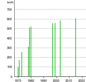 | Jahr | Land | Fahrzeug | Geschwindigkeit | Anmerkungen |