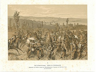 Am 3. Juli 1866 hatte der preußische König noch die Aufstellung eines II. Reserve-Korps verfügt, das sich Mitte Juli in Leipzig sammelte und aus zwei kombinierten Divisionen bestand. Die erste Division umfasste Truppenteile aus dem Königreich Preußen und dem Herzogtum Anhalt, die zweite solche aus dem Großherzogtum Mecklenburg-Schwerin, sowie aus den Herzogtümern Braunschweig und Sachsen-Altenburg.[9] Das etwa 25 000 Mann starke Korps stand unter dem Befehl des Großherzogs von Mecklenburg-Schwerin, Friedrich Franz II. Am 20. Juli begann das Korps seinen Vormarsch nach Süden über Werdau und Zwickau nach Altenburg. Über Werden und Plauen rückten die Verbände auf das bayerische Hof vor, das am 23. Juli ohne nennenswerte Kampfhandlungen eingenommen wurde. Dieser Einmarsch in Bayern bewirkte auch den Rückzug des bayerischen Armee-Korps von der Tauberlinie auf Würzburg, wodurch die Vereinigung des VII. und VIII. Bundes-Korps verhindert wurde.