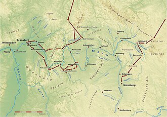 ![]() Weg der preußischen Mainarmee (Nordwesten) und des II. Reserve-Korps (Nordosten), Juli 1866 |