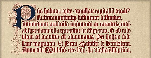 Im Mainzer Psalter findet sich auch das erste Impressum überhaupt, mit Angabe des Datums, des Druckers (Schöffer) und Verlegers (Fust). Außerdem findet sich in einem einzigen Exemplar das erste Drucker-Signet (das von Schöffer und Fust), das danach erst 1462 in der 48-zeiligen Bibel von Schöffer und Fust.[5]