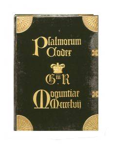 | 18th-century bookbinding with the monogram of George III, Mainz psalter, | http://www.royalcollection.org.uk/egallery/object.asp?object=1071478&row=0&detail=scrapbook | printed by Fust and Schoeffer | Datei:The Mainz Psalter, 1457.jpg |