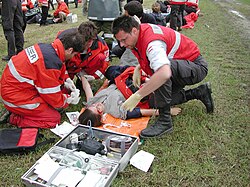 | Sanitäter des Malteser Hospitaldienst Austria üben bei einer im Mai 2000 stattgefundenen Bundes-Katastrophenübung das Versorgen einer verletzten Person | selbst photographiert | Benutzer:Alexander Wilkie | Datei:MHDA Mitglieder versorgen Verletzte Übung 2000.jpg | |
