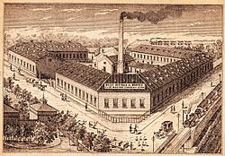 | Trade card showing the canned food factory of the brothers Weiss, the first in Hungary. It was founded around 1880 in Csepel, now part of Budapest. The reverse of the card mentions various meat products in cans and their prices ('0,5 Kg Goose Liver naturel 1 Fl 30 Kr', that was 70 dollarcents in 1885). The original measures 10 x 14 cm. | Berthold & Manfred Weiss Canned Foods, Hungarian trade card, about 1885 | Glatisant. Artwork by Unknown | Datei:Berthold Weiss Canned Foods.jpg | |