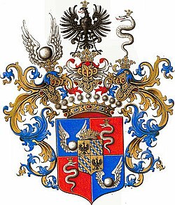 Blasonierung: „Geviert und belegt mit geviertem goldenen Herzschild, darin a) und d) ein rotbewehrter und gekrönter schwarzer Adler, b) und c) drei von Blau und Silber geschachte schrägrechts Balken (Stammwappen). – 1 und 4 in Blau eine beiderseits geflügelte silberne Kugel, 2 und 3 in Rot eine in vier Windungen einwärts aufgerichtete rotbezungte, goldgekrönte silberne Schlange. – Drei Helme, auf dem rechten mit blau-goldenen Decken die beiderseits geflügelte silberne Kugel, auf dem mittleren mit rot-silbernen Decken ein rot-bewehrter und gekrönter schwarzer Adler, auf dem linken mit blau-goldenen Decken die gekrönte Schlange.“ |