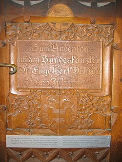 | Dollfuß-Gedenktafel mit Zusatztafel am Mariendom, Linz, Österreich | Eigene Kameraaufnahme | methossant Wikipedia User | Datei:LinzMariendomDollfusz.JPG | |