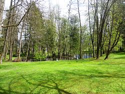 Schräg links vor dem Hauptgebäude liegt die 1987 errichtete „Belle Etage“ und ganz links eine kleine Villa, die von den derzeitigen Besitzern zeitweise bewohnt wird. Zu der Anlage zählt auch ein rechts des Hauptgebäudes liegender Pavillon, der einstmals ein beliebter Ort für Hochzeiten war. Zum großen Park mit seinem alten Baumbestand zählen auch verschiedene größere Fischteiche. Im Park finden sich alte Skulpturen, kleine Wasserläufe und -teiche, wobei die meisten Steinausführungen aus Konglomerat bestehen.