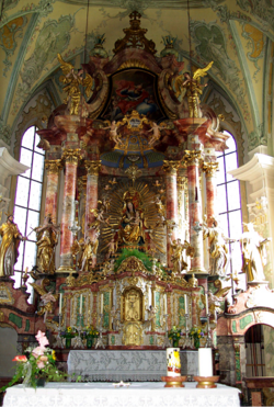 | Kath. Pfarrkirche hl. Maria und Friedhof | Eigenes Werk | Pinzgauer ( talk ) | Datei:Maria Alm Pfarrkirche Hauptaltar 1.png | |