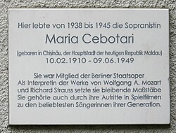 Gedenktafel für Maria Cebotari. Hessenallee 12, Berlin-Westend . Enthüllt am 11. Juli 2000. | Eigenes Werk | Axel Mauruszat | Datei:Gedenktafel Maria Cebotari.jpg | |