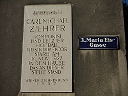 Carl Michael Ziehrer , Gedenktafel in Wien. | Eigenes Werk | Anton-kurt | Datei:CarlMichaelZiehrer.MariaEisGasse.ViennaB.JPG | |