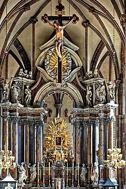 Mit dem gotischen Hallenraum kontrastiert der barocke, 1716 vom Veroneser Architekten Ranghieri errichtete, monumentale Hochaltar aus Marmor mit seinen vielen Säulen und Heiligenfiguren.[22] Der 1724 nach Deutschnofen transferierte Choraltar mit Plastiken des 15. Jahrhunderts blieb in weiteren Teilen auch in Zagreb erhalten.[23]