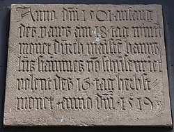 An der Südseite der Pfarrkirche ist eine exakte Kopie der aus örtlichem Sandstein gefertigten frühneuhochdeutschen Bauinschrift des Turmaufsatzes eingelassen. Das Original befindet sich im durchbrochenen Turmhelm der Kirche. Die Schriftform entspricht einer spätgotischen Minuskel. Die sechszeilige Inschrift lautet: