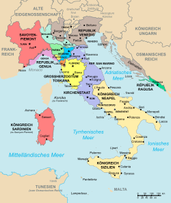 - ↑ Rudolf Lill: Geschichte Italiens vom 16. Jahrhundert bis zu den Anfängen des Faschismus. Wissenschaftliche Buchgesellschaft, Darmstadt 1980, S. 80.