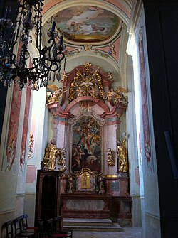 - Seitenaltäre: Der südliche Seitenaltar ist dem Wetterpatron Donatus gewidmet. Ihm zur Seite stehen der heilige Patrizius und der heilige Florian. Der nördliche Seitenaltar zeigt im Altarbild die Darstellung der Steinigung des heiligen Stephanus, die von Statuen der Heiligen Franz Xaver und Antonius von Padua flankiert wird.