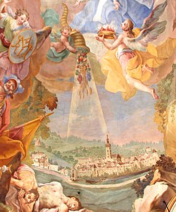 Mölk hat auch hier das Kapellenthema aufgegriffen, das Deckenfresko zeigt den Tod des heiligen Johannes in der Moldau und das Wunder seiner Auffindung.