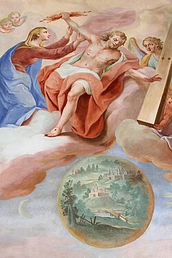 - Himmelfahrt der Gottesmutter: Im großen Deckenbild im Langhausgewölbe und über der Orgelempore ist in einer Landschaft mit Felsen, Pinien und Palmen die Himmelfahrt Mariens dargestellt. Rund um den leeren Sarkophag gruppieren sich die Apostel so, dass sie ein nach oben weisendes Dreieck bilden. An der Spitze, die auch die Bildmitte ist, sitzt Maria auf einer Wolke und wird von Engeln zu Jesus mit ausgebreiteten Arme emporgetragen. Ein Engel hinter ihm hält das Kreuz als Zeichen des Sieges über den Tod. Das Fresko ist am rechten unteren Rand signiert.