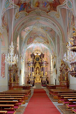 Die durch das Abschlagen der gotischen Gewölberippen und Wanddienste geschaffenen großen Decken- und Wandflächen boten Platz für eine großzügige und einheitliche Ausschmückung mit Fresken. 1770 vergab Pfarrer Christoph Max Jöchlinger den Auftrag zur Ausmalung der Kirche an Maler Joseph Adam Ritter von Mölk, der die Arbeiten 1772 zum 300-jährigen Bestand der Wallfahrtskirche vollendete.