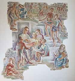 | Wandmalerei, geschaffen anlässlich der Schuleröffnung 1954. | Eigenes Werk | Mondl Karl | Datei:Stiegenhaus pri.jpg |
