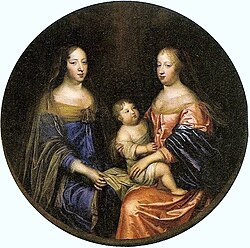 | Two Queens of France: Anne d'Autriche with her niece and daughter-in-law, Marie-Thérèse d'Espagne, who holds her son, the dauphin. | Love and Louis XIV by Antonia Fraser | Simon Renard de Saint-André / Ehemals zugeschrieben an Pierre Mignard | Datei:Anne of Austria with her daughter-in-law Queen Marie Thérèse holding the Dauphin Louis.jpg | |