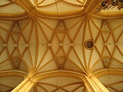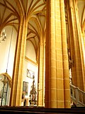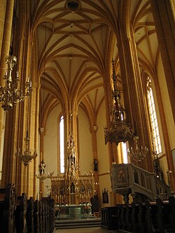 Bekannt ist die Kirche vor allem für das ungewöhnliche Gewölbe im Chorbereich. An das dreischiffige, vierjochige Langhaus anschließend folgt ein Hallenumgangschor mit einem zentralen Mittelpfeiler, der als sechseckiger Zentralraum gesehen werden kann. Im Langhaus besteht das Gewölbe aus jochweise gebildeten Rippensternen, die im breiteren Hauptschiff reicher gestaltet sind. Am westlichen Ende des Kirchenschiffs wurde 1751 von Steinmetzermeister Andreas Zeiller eine Orgelempore eingebaut, auf der sich eine Orgel von Friedrich Werner (1869) befindet. Im Inneren ist die Kirche 34 m lang und 16 m breit, die mit Dreipässen, Vierpässen und Fischblasen verzierten Fenster sind 9 m, die schön gestalteten Pfeiler 16 m hoch.
