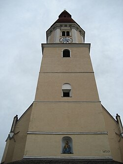 Von Kalsdorf oder Hausmannstätten kommend ist der 64,3 m hohe Turm an der Westseite der Kirche schon von weitem sichtbar. Auf den bereits seit der Bauzeit der Kirche bestehenden quadratischen Unterbau wurde durch Michael Arhahn im Jahr 1669 der Turm gesetzt, den eine barocke Zwiebelkuppel von 1742 krönt. Die Jahrzahl 1609, die am unteren Ende des Turms zu sehen ist, müsste richtig 1669 heißen. Bis zum Bau des Turmes war die Westfassade der Kirche oberhalb der Turmhalle frei und mit zwei Fenstern und Statuen geschmückt. Die barocke, aus einem Stück Eichenholz geschnitzte Turmmadonna wird Wilhelm Storer zugeschrieben und entstand um 1676. Am südwestlichen Turmpfeiler ist ein Relief des Hl. Christophorus zu sehen, das inzwischen aber schwer beschädigt ist. In der Turmvorhalle unter dem Turm befindet sich schließlich das von Josef Schkotnigg gestaltete barocke Hauptportal von 1734.