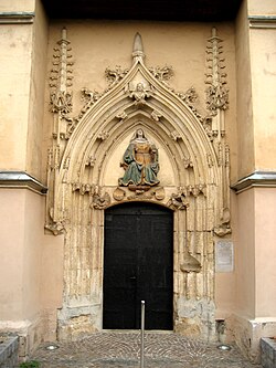 Vom selben Meister, der das Christophorusrelief gestaltet hat, stammt auch die reiche Verzierung des Südportals: Fialen, Krabben und Kreuzblumen. Zu sehen sind im Tympanon sitzend Maria und über ihr ein Engel.