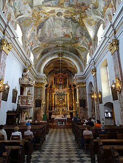 1673 wurde ein erster barocker Kirchenbau von Giovanni Battista Delai aufgeführt, der von 1719 bis 1722 vom Innsbrucker Architekten Johann Martin Gumpp und seinem Kollegen Augustin Maria Abfalterer umgebaut wurde. Die Deckengemälde wurden 1753 von Joseph Adam Mölckh angefertigt.