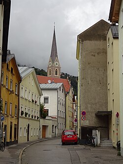 Aus der 1502 geweihten kleinen Kirche des Leprosenhauses entwickelte sich die spätere Pfarre und Kirche St. Nikolaus. Da die Kirche im 19. Jahrhundert zu klein geworden war, gründete sich 1864 ein Kirchenbauverein. 1881 wurde der Neubau der St.-Nikolaus-Kirche nach Plänen von Friedrich von Schmidt im neugotischen Stil errichtet und 1885 geweiht.[8]