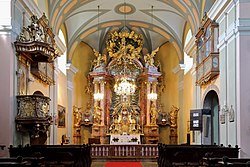 | Hochaltar der Kloster- und Wallfahrtskirche Hilfreiche Jungfrau Maria in Mariahilfberg , ein Weiler und Wallfahrtsort in der niederösterreichischen Marktgemeinde Gutenstein . Die Kirche wurde anstelle einer 1705 abgebrannten Kirche in vergrößerter Form von 1710 bis 1721/24 neu aufgebaut. Der Hochaltar wurde 1720 errichtet und 1766/67 sowie 1803/10 ergänzt. Die Hängekanzel ist ebenfalls ein Werk aus dem Jahr 1720. | Eigenes Werk | C.Stadler/Bwag | Datei:Mariahilfberg (Gutenstein) - Kirche, Hochaltar.JPG | |
