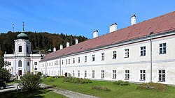 | Die Südfront des Serviten-Klostergebäudes in Mariahilfberg , ein Weiler und Wallfahrtsort in der niederösterreichischen Marktgemeinde Gutenstein . Links die Kloster- und Wallfahrtskirche und dahinter der Sender Gutenstein-Residenzberg . Nachdem Johann Balthasar II., Graf von Hoyos, 1672 den Serviten die Betreuung der Wallfahrtskirche übertrug, stiftete er ihnen das Kloster. Diese ließen von 1679 bis 1685 im stumpfen Winkel an die Vorhalle der Wallfahrtskirche einen langgestreckten, zweigeschossigen Bau durch den Maurermeister Peter Baron und dem Zimmermeister Mathias Nietl errichten. 1724 wurde das Klostergebäude um vier Fensterachsen erweitert. | Eigenes Werk | C.Stadler/Bwag | Datei:Mariahilfberg (Gutenstein) - Kloster.JPG | |
