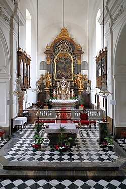 Eine frühere Pendentifkuppel über dem Presbyterium wurde ebenso wie die Stuckdekoration und die ehemaligen Deckenfresken von Josef Adam Mölk 1881 entfernt. Die Seccomalereien im Mittelschiff – Verkündigung an Maria, Geburt Christi, Kreuztragung Christi und Krönung Mariens – schuf Heinrich Schwach im letzten Viertel des 19. Jahrhunderts.