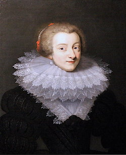 | "The alleged portrait of Marie de Rohan, Duchess of Chevreuse, in widow's dress after the death of her first husband, the Duke of Luynes in 1621 ... She is dressed in a white blouse, and over it a black silk dress with puffed and intercut sleevesd, her tight waist contrasting with the amplitude of the lace ruff. The notch of her dress is adorned with an elegant and sober black silk bow, no doubt due to her mourning." | Galerie Antiquités 4 | Kreis d. Daniel Dumonstier | Datei:Marie de Rohan Chevreuse.png |