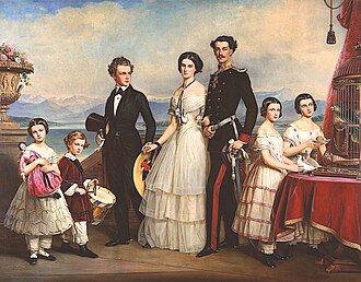 Geschwister der Kaiserin Elisabeth von Österreich auf der Veranda des Schlosses Possenhofen, von links, : Sophie (1847-1897), Maximilian Emanuel (Mapperl, 1849-1893), Carl Theodor (Gackel, 1839-1909), Helene (Nené, 1834-1890), Ludwig Wilhelm (Louis, 1831-1920), Mathilde (Spatz, 1843-1925) und Maria Sophie (1841-1925) | Ursprung unbekannt Unknown source | Karl Joseph Stieler | Datei:Geschwister der Kaiserin Elisabeth von Österreich auf der Veranda des Schlosses Possenhofen.jpg | |