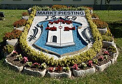 | Wappen der Marktgemeinde Piesting aus Blumen geformt, Grünanlage der Seisermühle (denkmalgeschütztes Gebäude), Niederösterreich | Eigenes Werk | P e z i | Datei:Markt-Piesting-Wappen aus Blumen Seisermuehle DSC 1826w.jpg | |
