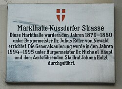 | Tafel an der Markthalle Nussdorf in Wien-Alsergrund. | Eigenes Werk | GuentherZ | Datei:GuentherZ 2010-03-09 0032 Wien09 Markthalle Nussdorf Tafel.jpg | |