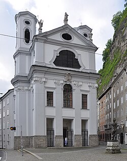 Auf dem schmalen Raum zwischen der hohen Felswand des Mönchsbergs und der Festungsmauer zur Salzach hin errichtete der Architekt ein Kirchengebäude mit harmonisch schwingenden Linien und barocker Lebendigkeit. Die Türme sind den schmalen Raum nutzend seitlich zurückgesetzt und geben Raum für eine großzügige Vorhalle.