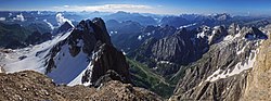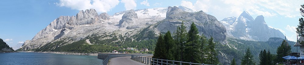 | Marmolata gesehen vom Col di Rosc (2383 m) im Sommer 2019. Links der Lago di Fedaia mit dem Pelmo (3268 m) darüber, der höchste Gipfel rechts der Mitte ist der Gran Vernel (3210 m). | Eigenes Werk | 2015 Michael 2015 | Datei:Marmolata, 3343m.jpg | |