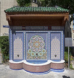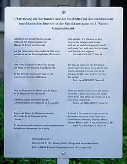 | Übersetzung der Inschriften am Marokkanerbrunnen, Wien Landstraße | Eigenes Werk | P e z i | Datei:Marokkanerbrunnen Inschrift DSC 1822w.jpg |