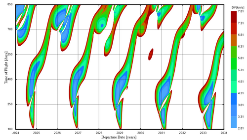 | "Porkchop plot" of the time needed for space travel from Earth to Mars, depending on date and launch-delta-v; timespan beginning of 2024 to end of 2033. Computer-generated graphics, made by GPLv3-licensed software. | 1 | Juan Luis Gonzalo | Datei:Mars launch windows 2024–2033.png | |