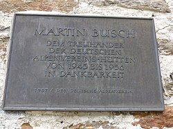| Gedenktafel für Martin Busch an der nach ihm benannten Alpenvereinshütte | Eigenes Werk | Whgler | Datei:Martin-Busch-Hütte Gedenktafel.jpg |