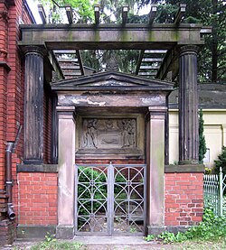 | Grab des Architekten Martin Gropius (1824-1880) auf dem Dreifaltigkeitsfriedhof II an der Bergmannstraße in Berlin-Kreuzberg. Die Grabanlage in Form einer Pergola entstand nach Entwürfen von Gropius selbst und von Heinrich Strack. Das Sandsteinrelief an der Grabwand stammt von dem Bildhauer Rudolf Siemering. Ehrengrab Land Berlin. | Eigenes Werk | Jörg Zägel | Datei:Berlin, Kreuzberg, Bergmannstrasse, Dreifaltigkeitsfriedhof II, Grab Martin Gropius 01.jpg | |