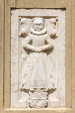 | Epitaph für Katharina Pacobello (Tochter des Renaissance-Bildhauers Martin Pacobello ) an der Südwand der Hauptstadtpfarrkirche Sankt Egid am Pfarrplatz, Klagenfurt , Kärnten , Österreich , EU | Eigenes Werk | Johann Jaritz | Datei:Klagenfurt Stadtpfarrkirche St. Egid Epitaph Katharina Pacobello 18052020 8991.jpg | |