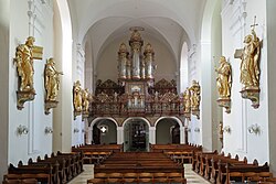 | Blick zur Orgelempore in der Martinskirche in der niederösterreichischen Stadt Klosterneuburg . | Eigenes Werk | C.Stadler/Bwag | Datei:Martinskirche Klosterneuburg Richtung Orgelempore.JPG |