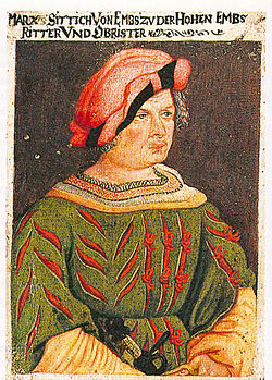 | Merk Sittich von Ems Söldnerführer | Bregenz, Vorarlberger Landesmuseum. Eingescannt aus: Alois Niederstätter: Das Jahrhundert der Mitte. Österreichische Geschichte 1400 - 1522. Wien 1996 | Datei:214Merk Sittich von Ems.jpg | ||