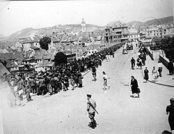 Nach der Besetzung und Aufteilung Jugoslawiens 1941 kam es sowohl zur Kollaboration als auch zum bewaffneten Widerstand. Die Folge war eine starke Polarisierung in der Bevölkerung. Das Regime des Unabhängigen Staates Kroatien sah einen Genozid[12][13][14][15][16] an der serbischen Bevölkerung vor.[17] Juden und Roma wurden deportiert; auf der anderen Seite verübten Tschetniks Massaker an Kroaten, Albanern und Bosniaken sowie Partisanen Racheakte an ganzen Bevölkerungsgruppen.[18]