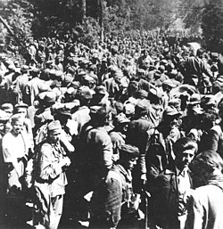 - ↑ Auszug aus dem Bericht des Ante Dragošević vom 8. und 9. Mai 1959 in Rom. Abgedruckt in John Prcela, Stanko Guldescu: Operation Slaughterhouse : Eyewitness Accounts of Postwar Massacres in Yugoslavia [Operation Schlachthaus : Augenzeugenberichte von Nachkriegsmassakern in Jugoslawien]. 1. Auflage. Dorrance, Philadelphia 1970, Document XXVI, S. 286–288 (englisch): “We began our retreat from Zagreb on May 6, 1945, passing through Ilica to Zapresic, and then along the route Zidani Most–Celje–Slovenjgradec–Bleiburg. Although we did have to brush aside Communist resistance here and there, combat was rare. […] I remember that when we went through Celje, the Partisans were in possession of the town. Although they disarmed the German troops who were retreating along with us, they were afraid to oppose the passage of our contingent. […] The military morale of our troops was very high. […] Perhaps, this was because allegedly reliable information was circulating through our ranks to the effect that the political authorities of the Croatian State had made an agreement with the British for an honorable capitulation. […] Shortly after sunrise on May 15, we reached a small field about a mile and a half from the great meadow near Bleiburg. Following a short period of rest, we went on to the Bleiburg field, arriving between nine and ten o’clock in the morning. The great flat or rolling expanse of land on which we found ourselves, was packed full of troops and civilian refugees, many of whom were women and children. There was also a great number of vehicles and even some cattle. British planes hovered overhead, and we were foolish enough to greet their presence with enthusiasm, tossing our caps into the air and waving to them. A Croatian Air Force officer warned us, however, that the British were making a display of their military strength only to intimidate us to surrendering. The English planes flew very low over our heads several times. About three o’clock that afternoon, we were advised that we were to lay down our arms, and display white flags. Afterwards we received orders to advance to the edge of the woods, where the process of surrender would be initiated. As we approached the woods I saw Yugoslav Communist troops standing in line along the border of the forest. […] They adressed us with great courtesy and even with submissivness and humility. Without voicing any threats whatsoever, they asked us to surrender all of our weapons because the war was over and we were going to be allowed to return to our homes. […] We were fools enough to believe them, so we threw away our last chance to escape. […] In our naivete, we had assumed that the British would have the good sense to accept our surrender and thus secure valuable allies for themselves in the struggle that they must sooner or later engage in with the Russians. […] We were astonished to find that we were expected to capitulate to the Communists. Great confusion attended the surrender of our arms, which dragged on over a long period of time. The Communists adressed a number of questions to each man. About twenty yards away from where I was standing, a young Domobran lieutenant committed suicide in a fit of despair. […] The Domobran lieutenant was not the only one who took this way out of the predicament in which we suddenly found ourselves. Dusk fell before the surrender of our weapons was completed. We were ordered to line up in columns of fours, and begin the march back to the Domovina.”