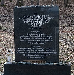 „Hier ruhen siebenundfünfzig jüdische Märtyrer aus Ungarn, die am 29. März 1945 von nationalsozialistischen Barbaren ermordet und hier im Wald verscharrt wurden. Möge ihr Andenken gesegnet sein! Im Monat Dezember 1995“